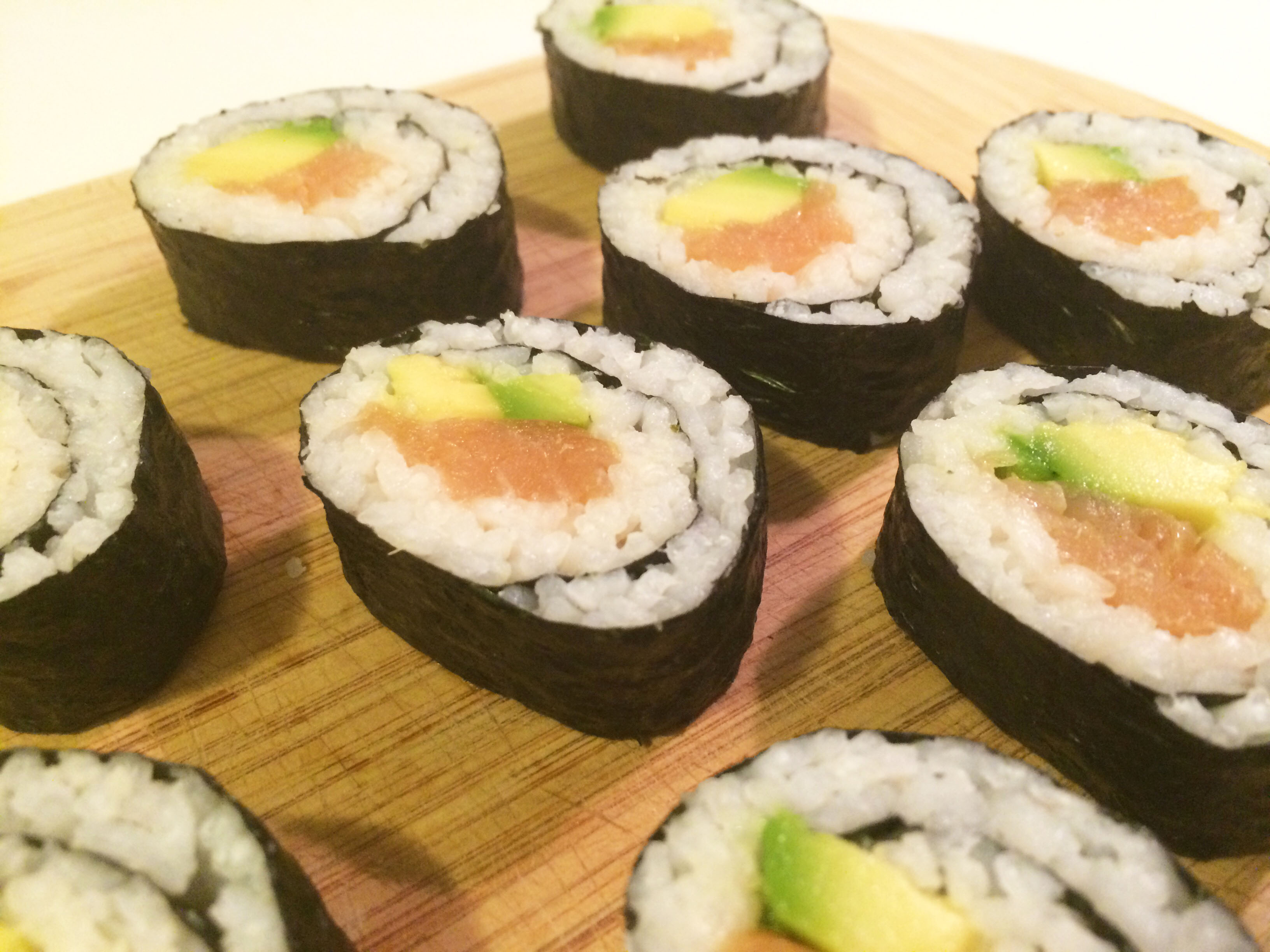 V suši sem dala dimljen losos in avokado, ki sem ga poškropila z limono, da ne bi oksidiral. Med pripravo sem se malo igrala s količino nadeva in šele pri četrti rolici ugotovila najboljšo količino, da se je suši lepo kompaktno zrolal. Ker sem sušija naredila veliko, sva ga imela za večerjo in še za malico naslednji dan. Prav fancy sem se počutila, ko sem med odmorom v službi jedla tako eksotično jed. :)